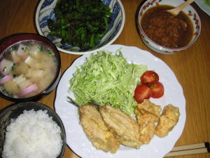 今日の晩御飯は「鰯のフリッター」です。後、鶏ささみチーズのフリッターと、梅肉ソース、味噌汁、菜の花のお浸しです。今日も一人で夕食。揚げたては美味しかった。。旦那さんが食べる頃にはふにゃふにゃですよ。今日は一日雪でしたが、積もりませんでした。残念。。明日はどうかな?明日もバッグスクールに行く予定です。夜遅いから寒いのは嫌だな~。