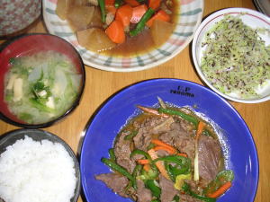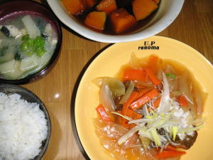 今日の晩御飯は「肉野菜炒め」です。後は、昨日の残り物の煮物と、キャベツのゆかり和えと、味噌汁、納豆です。昨日の煮物が沢山余っていたので、今日は一品手抜きをしました。それと、キャベツのゆかり和え。。これは、夜勤弁当用に作ったのですが、沢山作り過ぎた為、晩御飯にも登場です。千切り?百切り?くらいにしたキャベツを茹で、搾って、ご飯にかける「ゆかり」を和えるだけ。簡単で美味しい。。お漬物みたいな感じになります。今日も変わらず、管理画面重たい。この時間はまだマシ。。最近は重たかったらその日に書き込むのは諦めることにしました。。