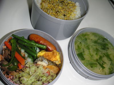 本日のお弁当です。【メニュー】・肉野菜炒め・キャベツのゆかり和え・いんげんのバター炒め・ぶりのしょうが焼・ウインナー・卵焼き・大根と水菜の味噌汁夜勤弁当です。3連休の後の出勤は、何だか気が重たいようです。でも、また3日行ったらお休みだから頑張って下さい。昨日はフットサルの練習でした。最近動くとすぐ、右のひざの裏が痛みます。寒さからなのかスジがピンっと張ったような痛みです。フットサルのし過ぎですかね。。これから約一ヶ月、チームの練習は今のところありません。この間に治すとします。。