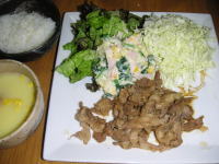 今日の晩御飯は「豚のしょうが焼き」です。後は、お湯を入れるだけのコーンスープと、付け合せにポテトサラダ、キャベツの千切りです。正月遊び疲れ。。スーパーに行ったものの全然思考能力がなく、安い豚肉を発見。しょうが焼きでいいか!と、そんな感じでメニュー決定です。洗い物も少なくする為、サラダも千切りもワンプレートに全部乗せてしまいました。正月料理で、贅沢三昧。。またまた口内炎を発症。野菜をたっぷり摂って体調を整えたいと思います。7日には、七草粥をしないとね・・・