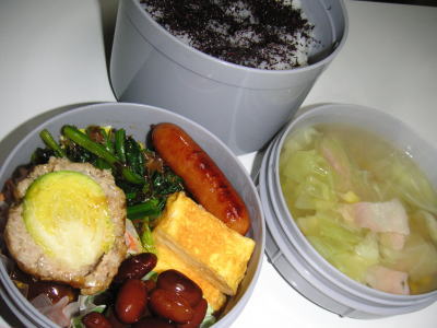 本日のお弁当です。【メニュー】・芽キャベツの肉団子・ほうれん草のお浸し・金時豆・ウインナー・卵焼き・ベーコンとキャベツのコンソメスープ旦那さんは今日から昼勤務です。昨日は、夜遅くに帰宅した為、朝起きるのがかなりつらかったです。しかも二度寝して、6時起きが6時15分だったし。。朝の15分は痛いです。ですが、頑張って作りました。芽キャベツの肉団子は、実家の母から貰ったものです。スープも朝から、手作りです。二度寝したことにビックリして、以外と頭が冴えてたので、段取りよく料理できました。明日は日曜ですが、旦那さんは出勤です。4日行ったら休みなので頑張って下さい。