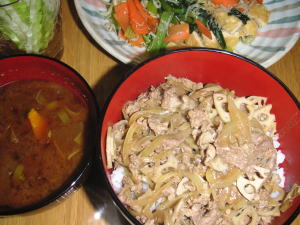 今日の晩御飯は「牛丼」です。後は、赤だし、小松菜と油揚げの炒め煮、セロリスティックです。このメニューになぜかセロリスティック。。母にセロリもらったら、食べたくなりました。今日は、朝から雪でした。夜になっても止む事はなく、きっと明日朝起きると真っ白でしょう。こんな雪降る中、旦那さんはフットサルでした。すごいなー
