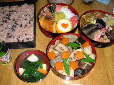 明けましておめでとうございます!今年も宜しくお願いします。2008年のおせち料理ですが、ほとんど実家の母に貰ったものばかりです。朝は、お雑煮も作りました。実家の母の煮物です。この段は、栗きんとんと田作りが私の手作り。その他は、実家からの頂き物。ぶりの照り焼きが手作りです。お酒、醤油、みりんの合わせたものに浸しておいたぶりを、オーブンで焼きます。オーブンで焼くと、かたよって焦げたりしないで、ふっくら焼きあがります。数の子は、塩抜きし、だし醤油に付けておいたもの。後は、お赤飯。お豆から炊いてみました。朝からいっぱい食べてしまいました。どれもこれも美味しくて。。自画自賛ですが、栗きんとん、旦那さんの実家のお芋が美味しかったのか、上手に出来ました。しばらく料理はしないで、おせち料理で寝正月します。。