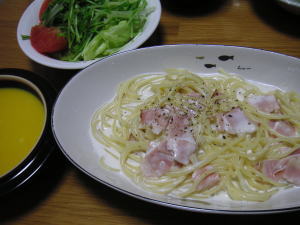 晩御飯は「スパゲティーカルボナーラ」です。後は、サラダと、かぼちゃのポタージュスープです。カルボナーラは、ベーコン炒めて、生クリームを加えて一から作りました。いつもコテコテになってしまうけど、今日のはコテコテにならず、お味も美味しかったです。かぼちゃのポタージュは、かぼちゃだけでなく、玉葱・人参・セロリも入っています。何が入っているか知ってるから、いろんな味がする感じだけど、知らなかったら、かぼちゃスープなので、野菜の嫌いな人も沢山野菜を摂ることできますね。
