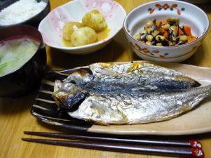 晩御飯は「秋刀魚」でした。後は、かぼちゃの煮物、ほうれん草としいたけのバター醤油、味噌汁、納豆です。久々にまともな夕食を作ったので、写真を撮るの忘れてました。ちょっと、秋刀魚つついてます。ほうれん草としいたけのバター醤油は、生のほうれん草を、グラタン皿に引き、バターを乗せます。そこへ、しいたけを乗せ、チーズを乗せ、塩コショウ。電子レンジで、チーズがとろけるくらいチンします。その後、マヨネーズと醤油をかけてオーブンで焦げ目を付けたら出来上がり!