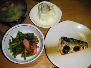 今日の晩御飯は「焼塩さば」です。後は、ほうば味噌のせ冷奴、菜花とウインナーのトマトソース炒め、味噌汁です。菜花とウインナーのトマトソース炒めは、昨日の残り物のアレンジです。トマトソースがもったいないので、今日のおかずに使ってみました。ちょっと醤油とおだしを足して、和風にアレンジです。ほうば味噌のせ冷奴は、かなり美味しかったです。お味噌はそのままのせましたが、ちょっと、お湯で伸ばして、豆腐に絡めて食べても良かったかもしれないです。ほうば味噌使ったレシピをどんどん考えたいと思います。