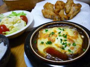 晩御飯は「カレーグラタン」でした。後は、鶏のから揚げ、ポテトサラダです。カレーグラタンは、前の晩御飯のアレンジです。この日は、実家の母に煮込みハンバーグを貰いました。まず、グラタン皿に煮込みハンバーグをおきます。その周りに茹でたマカロニを入れ、そこへ残ったカレーを掛けます。ちょっと真ん中をくぼめて、温泉卵を乗せます。チーズを乗せて、焦げ目が付くまでオーブンで焼きます。最後の仕上げにパセリを乗せます。温泉卵のとろとろ感と、ハンバーグとカレーの組み合わせが、最高に美味しかったです。ちなみに、ポテトサラダも貰ったものなので、かなり手抜き料理でありました。