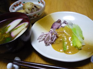今日の晩御飯は「いかの酢味噌和え」です。後は、肉じゃがと、豆腐の澄まし汁です。いかの酢味噌和えは、もちろん、ほうば味噌です。ほうば味噌に、お酢とからしを少々入れます。ほうば味噌は、甘いので砂糖は入れません。うちには、からしは無いので、納豆についているからしをちょっと失礼しました。
