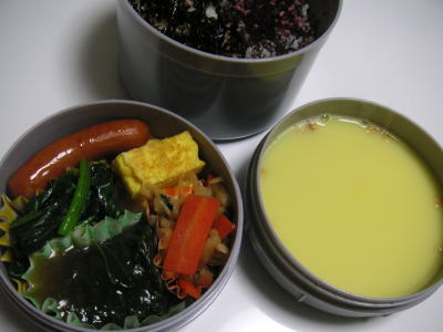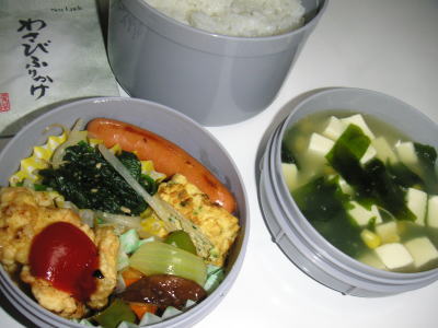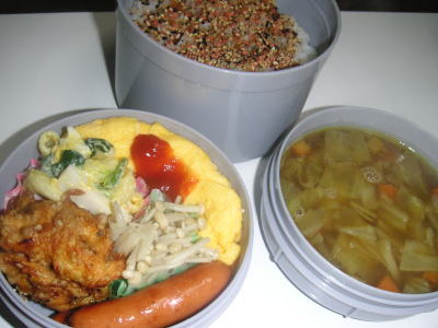 本日の昼勤弁当です。【メニュー】・鶏のゴマから揚げ・えのきのバター炒め・マカロニサラダ・ウインナー・チーズオムレツ・カレースープ今日のお弁当は、完全に洋食にしてみました。いつもの卵焼きは今日はお休み。。カレースープは旦那さんが食べるお昼には、油が浮いてますね。きっと。。今日はおひな祭り。何か、特別なメニューにしようかな?