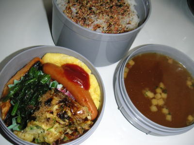 本日の昼勤弁当です。【メニュー】・焼塩鮭・お好み焼き・ほうれん草のお浸し・ウインナー・オムレツ・オニオンスープ今日の朝は怒りながらの弁当作りです。旦那さんが、フットサルの集まりとか言って、帰宅が夜中の2時過ぎだったのです。遅くなると、連絡はあったのですが、いつもは遅くても0時くらいでしたので、今回もそのくらいか、やや遅いくらいだろうと思っていたら、この時間・・・次の日も仕事だし、もう少し考えて下さい。