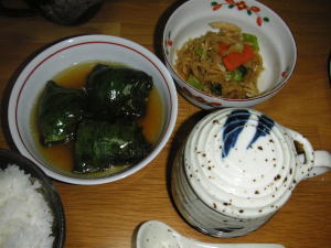 今日の晩御飯「ロール豚チンゲン菜」です。後は、ちゃわん蒸しと、切干大根の煮物、ほうば味噌です。ロール豚チンゲン菜は、軽く茹でたチンゲン菜を2枚広げておき、豚バラ肉の薄切りをおき、クルクルと巻きます。醤油ベースのだし汁で煮て、片栗で閉じます。ちゃわん蒸しの入っている陶器は、昨日の結婚式の引き出物です。バラエティーセットらしいです。カップに蓋とスプーンが付いています。蓋は、しょうが擦れるようなぶつぶつが付いています。スープを入れても良し、普通にコーヒーを入れても良し、めんつゆ入れても良し。5つセットで、とっても可愛いです。これから活躍してくれそうです。