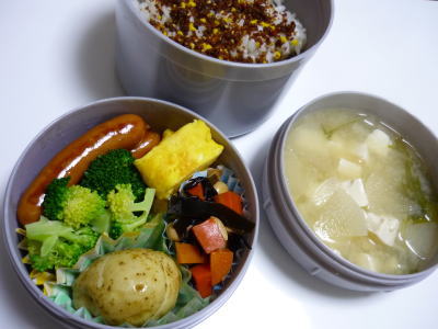 本日の昼勤弁当です。【メニュー】・じゃがバター・煮豆・ブロッコリー・ウインナー・玉子焼き・味噌汁新デジカメ、お弁当も鮮やかです。ますます、ちゃんと彩りよく作らなくちゃ!です。今日の夜は、バッグスクールです。作品展までに後2日。今日で完成するとは思えない・・・