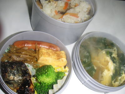 本日の昼勤のお弁当です。【メニュー】・塩焼鯖・きんぴらごぼう・ブロッコリー・ウインナー・卵焼き・ほうれん卵の澄まし汁きんぴらごぼうは、昨日ちらし寿司の具に入れたゴボウの余りであらかじめ前の晩に作っておいたものです。やっぱり前の晩に仕込んでおくのが楽ですね。