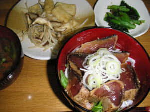 晩御飯は「かつおの漬け丼」でした。後は、もやしとしいたけとはんぺんのバター醤油炒めと、小松菜のお浸しと、味噌汁です。テレビでやっていたメニューを真似ました。かなり美味しかったです。簡単だし、また作ります。