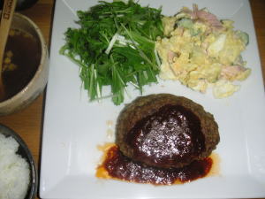 今日の晩御飯は「ハンバーグ」です。後は、ポテトサラダとインスタントのスープです。ハンバーグを焼いた後に、肉汁の入った油を捨てずにケチャップとお好みソースで、簡単ソースを作りましたが、かなり油浮いてますね。でも、いつもケチャップなので、たまにはいいですね。洋食のレパートリーがすごく少ない。。。もっと色々調べて作りたいと思います。