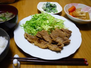 今日の晩御飯は「豚のしょうが焼」です。後は、大根の煮物、ほうれん草の白和え、味噌汁です。添え野菜は千切りキャベツだけじゃなくて、トマトでもあると、色合いが良かったですね。旦那さんに晩御飯は、お肉の和食とリクエストされていたので、しょうが焼になりました。てか、お肉の和食がしょうが焼しか浮かびませんでした。