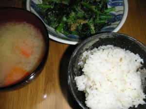 今日の晩御飯は「鯛めし」です。後は、ほうれん草と菜花のごま味噌和えと、味噌汁です。鯛めしは、2杯目は、鯛めしのだし茶漬けです。ねぎとわさびを入れて食べます。美味しかった。。いっぱい炊いたので、明日の朝も食べます。