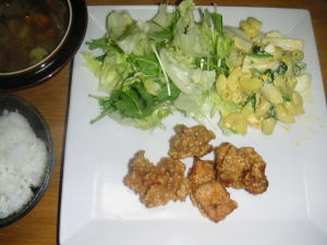 今日の晩御飯は「鶏のゴマから揚げ」です。後は、マカロニサラダ、カレースープです。カレースープは、残り物のカレーをスープにしました。鶏のゴマから揚げは、本に載っているのを作りました。美味しかったので、レシピ載せます。是非作ってみてください。【鶏のゴマから揚げ】材料(2人分)・鶏もも肉・・・1枚(200g)A・ショウガ汁・・・大さじ1/4・しょうゆ・・・大さじ1・酒・・・大さじ1/4B・溶き卵・・・1/2個・豆板醤・・・小さじ1/2・ゴマ油・・・大さじ1/2・片栗粉・・・大さじ3・炒りゴマ(白)・・・大さじ2揚げ油・・・適宜1.下ごしらえをする鶏肉は3cm角に切り、Aをもみ込んで5分おきます。ここにBを加えて混ぜます。2.揚げる揚げ油を170度に熱し、1.を1つずつ入れ、3~4分かけて、こんがり揚げます。