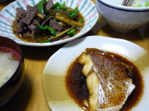 今日の晩御飯は「鯛の煮付け」です。後は、チンジャオロースーと、味噌汁、納豆です。美味しそうな鯛の切り身が売っていましたので、煮付けにしてみました。脂がのっていて、美味しかったです。チンジャオロースーは、実家から貰ったお肉と、冷蔵庫の中の余り野菜で作りました。味付けは、焼肉のたれ。。これも余り物。。。明日は、久々に洋食が食べたいな。。