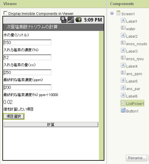 今回はちょっと特殊なアプリを作ってみました。食品工場に務めている人はわかるとおもうのですが、次亜塩素酸ナトリウムで殺菌するときに、殺菌層によって濃度が異なる場合があります。特に入れるものによって水の量が変わる場合などは、その都度計算しなくてはならない場合があります。そんな時に使いたいアプリです画面配置はラベルとテキストとボタンとリストピッカーです。リストピッカーは「ElementsFromString」でリストの一覧を設定して選んでもらうコンポーネントです。リストピッカーで答えを導きたい項目を選択します。blockを設定します実際の計算している画面です