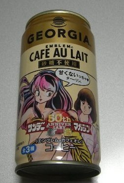 ジョージア エンブレムカフェオレが「少年サンデー・少年マガジン50th ANNIVERSARY」のデザイン缶でした。全3種類。おまけではないけど、かわいいので「うる星やつら」と「タッチ」のデザインを買いました。「甘くないっちゃ♥ダ~リン。」だそうです。