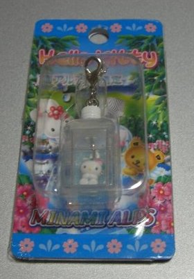 ご当地キティのファスナーマスコット「南アルプス限定 南アルプスキティ 水の妖精」「信州限定 神州一味噌みこちゃんキティ」みこちゃんと一緒にお碗に入ってるキティ、おにぎりを持っています。ペットボトルの中にキティが入ってて、おもしろいてすね。 南アルプス天然水キティ(ペットボトル型)ファスナーマスコット