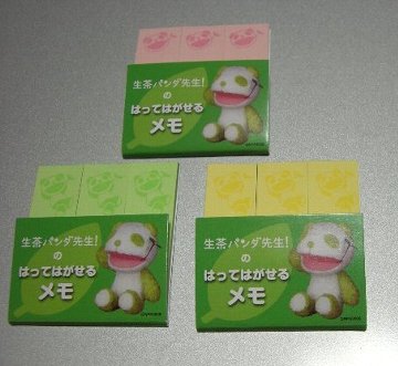 生茶の2LPETに「生茶パンダ先生!のはってはがせるメモ」か「生茶パンダ先生!ボールペン」が付いてました。3種類ずつの全6種類。1ケース買ったら、全種類付いてました。ボールペンは全部黒です。デザインのパンダは写真かな。ボールペンの生茶パンダ先生はちょっと微妙だな。メモはかわいいけど。