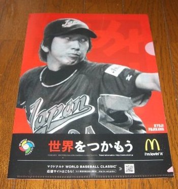 マクドナルドでクォーターパウンダーセットを購入すると「WORLD BASEBALL CLASSIC日本代表応援ファイル」がもらえました。地域によって対象商品は違うみたいです。全8種類。「」をもらいました。選べないので、阪神ファンの私にとっては当たりです。阪神以外興味ないから他の選手はあまり知らないしね。関西は藤川選手のファイルが多いとか、地域によってそれぞれ枚数が違ったりするのかなのかな。 WORLD BASEBALL CLASSIC™ 日本代表応援ファイルプレゼント McDonald's Japan