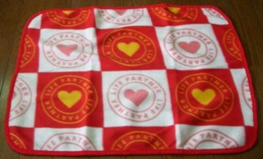 BOSSを4缶買うと「フリースブランケット」がもらえました。赤・水色・黄色の全3種類。水色もよかったけど、先月のおまけで水色のブランケットもらったから、今回は「赤」にしました。ミニブランケットです。LIFE PARTNERの文字とハートのマークの柄なんだけど、これって本当はDAKARAのおまけじゃないのかな。
