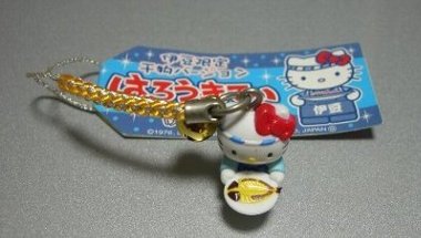 ご当地キティの根付「伊豆限定 干物バージョン」干物を持ったキティちゃん。干物は好きじゃないけど、キティちゃんに差し出されたら、食べちゃいそう。 【ご当地キティ】伊豆限定 干物ハローキティ根付ストラップ
