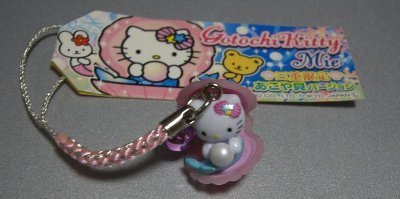 ご当地キティの根付「三重限定 あこや貝バージョン」貝の中に人魚キティが入ってます。リボンも貝の形。ピンクでかわいい。 三重限定 ハローキティあこや貝キティ根付け