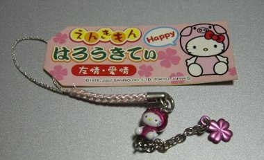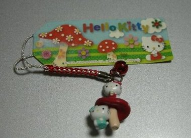 限定キティの根付「キノコバージョン」ハート模様のきのこがわいい。キティとミミィ、2人いるのでお得な感じだね。 キノコキティ根付