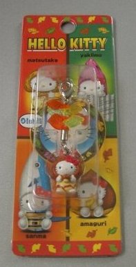 限定キティのファスナーマスコット、根付「秋の味覚 マツタケ」秋の味覚っていろいろありますよね。一般的に秋といえば松茸かな。マツタケになったキティがマツタケを持っています。 秋の味覚ハローキティ根付ストラップ(松茸)