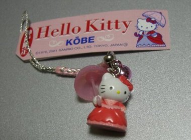 ご当地キティの根付「神戸限定 神戸キティ」赤いドレスにピンクの日傘でお洒落なキティ、異人館を歩いてるのかな。これってかなり初期に出てた気がする。商品名も神戸キティだし。 ハローキティ・ストラップ神戸のレディ