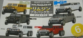 ボス 食後の余韻2缶に「HAMMER リムジンプルバックカー ダイキャスト製」が付いてました。全6種類。「H2 red」を選びました。タイヤが6個付いてる。リムジン、乗ってみたいな~。