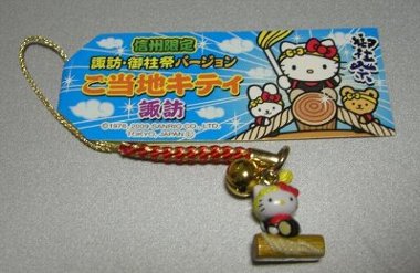 ご当地キティの根付「信州限定 諏訪・御柱祭バージョン」御柱祭って7年に1度の祭りなんですね。木にまたがってる、命がけ?のりりしいキティちゃん。 信州限定 諏訪・御柱祭キティ根付ストラップ