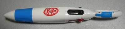 ampmでキットカットを2個購入すると「キットカット4色ボールペン」がもらえました。全何種類か分からないけど、「水色」を選びました。カラビナ付です。