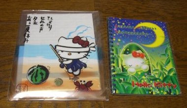 限定キティの福袋「ハローキティ 1000円ポッキリ福袋」約4400円分入って1000円なのでお得ですね。「かぐや姫バージョンB6リングノート」「夏の和み スイカ割りレターセット」「牧場限定シャープペン」「夏の和み 花火 ぬいぐるみ」「みのむしバージョン ハンドタオル」「みのむしバージョン ジッパーチャーム」の6点。どれもかわいいし、使えるし良かった。ハンドタオルは小さいと思ってたけど、結構大きいです。ジッパーチャームは集めてるし、この2点が特に良かったな。1980円福袋もあり、これらにバスタオルが付いて、ジッパーチャームが2つ折りストラップに変わって7点入ってるそうです。 七夕限定大特価キティ!◇ハローキティかぐや姫バージョンB6リングノート ハローキティ みのむしバージョン(ジッパーチャーム) キティ限定商品!大好評のビッグスター福袋!◇ハローキティ1000円ポッキリ福袋(福箱)価格:1,000円(税込、送料別) キティ限定商品!大好評のビッグスター福袋!◇ハローキティ1980円福袋(福箱)価格:1,980円(税込、送料別)