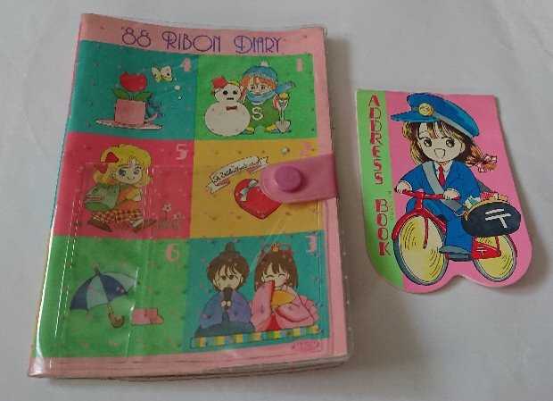 以前に紹介してた懐かしいりぼんの付録。もう残ってないと思ってた1988年1月号の「柊あおいの'88りぼんダイアリー+専用ビニールカバー+アドレス帳+香澄ちゃん応急手当カード+スケジュールシール」がでてきました。これは使ってたみたい。