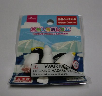 100均でみつけた「おもしろ消しゴム 南極のいきもの」ダイソー。イワトビペンギン、皇帝ペンギン、アザラシ。