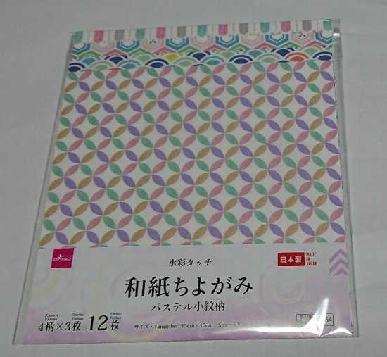 100均でみつけた「水彩タッチ和紙ちよがみ パステル小紋柄」ダイソー。4柄×3枚で12枚入り。