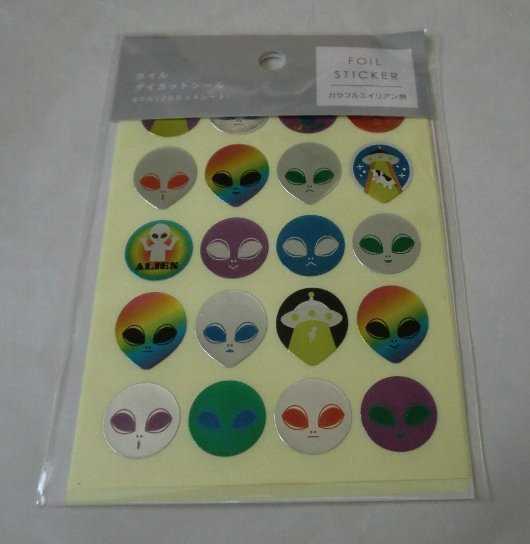 100均でみつけた「ホイルダイカットシール カラフルエイリアン柄」セリア。20片×4シート。