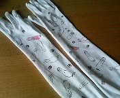 今日は台風が近づいてるみたいで、お天気が怪しくなってきました。梅雨もあけ、日差しがキツイ今日この頃・・私は歩くのをやめて駅までチャリでいくようになりました。チャリって意外と腕がやけるんです。日焼けしないようにロング手袋なるものを今年から活用しはじめました。(*´▽`*)この前ふらっと100均に行ったら、ドライブ手袋が売っているではありませんか。私が持っているのは100円では買えませんでしたのよ!!迷わず購入しました♪でも、無地なので・・・なんか物足りない・・お絵かきしちゃいました。 ボーリングのピン?豆子?たらこ??絵が怪しいので見たらプッ(´゚c_,゚` )って感じです。このお絵かき、トールで使っているアクリルペイントに『ジョソーニア・テキスタイルメディウム』をまぜて使いました。描いた後、アイロンで押さえるとお洗濯しても落ちません。Tシャツなんかにもお絵かきできますよ♪