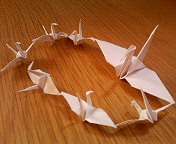 先日、実家に帰った時に母に折り紙を教えてもらい、さっそくおうちで実践。鶴の親子です。この親子鶴、全部繋がっているんです。うちの母は障子紙で折っていたので和紙チックでしかも大きい鶴たちで、とってもステキ。私はコピー用紙で折ったのでチープな感じ。お習字の紙でも折り目がしっかりするので、かわいく折れるんですよ!!