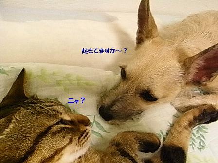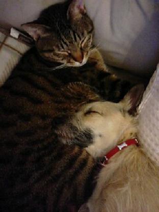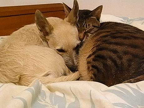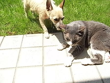 ここ数日、雨が降らなくてほんとに助かってます 今日は、わりと涼しくていっぱいお散歩できました。お散歩から帰ってきたモモ、スヤスヤ寝ているメルモの顔を覗き込んでまるでお散歩の報告してるみたいでした。 こうやって見てると、お互いどんな存在なんだろうなぁって不思議に思います。昨年、3ヶ月のモモをうちに迎えた時 メルモは寂しがるモモのゲージの上に乗って見守るようにしてくれてたり、時々ゲージのドアの前に、メルモのおもちゃが何個も集めたように置いてあったのを見て、「きっとメルモが、鳴いているモモの為にくわえて持ってきたんだ・ ・」と驚いたことがありました。 メルモは、2年前に逗子の海岸で トンビに兄弟達が襲われ1匹だけ生き残った子で、近所のおじいさんに助けられ、ボランティアさん経由でうちに来た子なので 怖い思いをしているせいかかなりのビビリちゃんですモモと一緒にいて大丈夫かと心配したのですが初めは心細い思いをしていたモモの気持ちを、種を超えてなにか通じるものがあったのかも知れません毎日、お留守番も長いけど 一緒に遊んでくれてる時もあるんだと思うとちょっと救われる思いですかわいい子供達がいてくれて、ママは幸せです(最近、暑いので寝てばかりいるプーチンおじいちゃんもね)