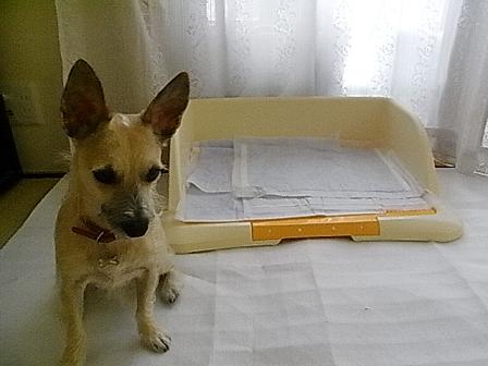 先日モモのトイレの(依然として未使用だった)場所を和室の窓際に移動しておいたのですがなんと今朝見たら、シートにおしっこの後が・ ・やった~っとモモを呼んで、褒めていたら トイレの側の2箇所ほどのカーテンに隠れたところに、なにやら茶色い物体が~おっきい方もセットで、したのね なんか複雑な心境 ・ ・まぁ、逆じゃなくて幸いでした。でも、これが習慣になってくれると(トイレ内限定)いいなぁ。欲をいえば、大ちゃんは お外でお願いできないでしょうか~ 「ママが、おうちでトイレって言うから ここでしてあげましたよ~」
