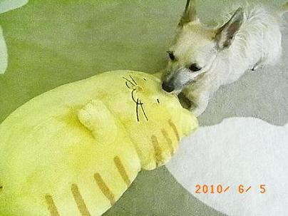 1ヶ月以上、ご無沙汰 しちゃいましたまだまだうっとおしい日が続きますね。暑くて 土日の散歩時間が短いので、モモはメルモと毎日 家の中を走り回っています。 最近、トラネコのフワフワぬいぐるみがお気に入りであれっ、大人しいな~って思っていると、こうやって抱き枕にしています。 柔らかくて気持ちいいです~早く梅雨が明けて、夏も過ぎて、過ごしやすい季節にならないかな~そしたら外で思いっきり走れるのにネ