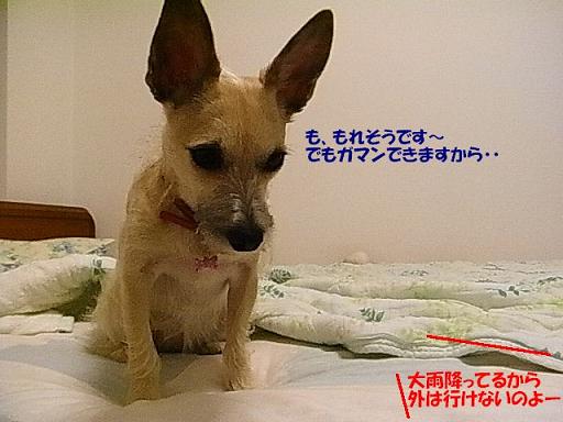 モモはとっても頑固な子です 火曜日大雨の日に、「今日がトイレトレーニングのチャンス」と思い、夜仕事から戻って 脱衣所にトイレを置き お腹を刺激したり、ワンツーワンツー応援しながら、シートが濡れていないかワクワクしつつ何度か見に行き、 クーンクーンとお鼻をならして鳴いても 心を鬼にして様子を見ていたのですが結局 夜の12時近くまで我慢し続けました朝から、なんと約17時間・ ・ これじゃ膀胱炎になっちゃうね今回はママの負けです それ、メルモのおもちゃだよおしっこは、したい時にしていいんだよ~ お口、全開で怖いよ~