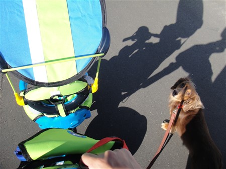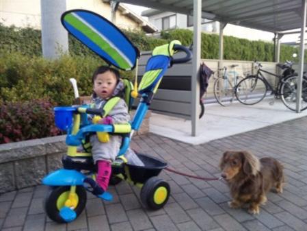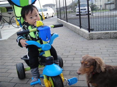 今日は雨って天気予報で行ってたけど、めっちゃ晴れました洗濯もできたし、布団も干せたし掃除もできてよかった今日は予定もないので、おうちでたいちゃんチェルちゃんとのんびりそして、約束通りチェルちゃん待望のお散歩へ今日も仲良く2人と1ワンでお散歩チェルちゃんもよっぽど嬉しかったのか、おしっこのポーズでうんぴッピをするというかなり間抜け行動を…他のワンコもするんかなぁ片足あげたままうんぴチェルちゃんの変な得意技ですたいちゃんは三輪車がよっぽど気にいたのかこれに乗ってお散歩に行くとず~~~っと一人でしゃべってますあたしも真似して一緒に宇宙語をしゃべりながら30分ほどウ~ロウロ『ボク楽しかったわぁ』『あかん…オレのどカラカラや』今日の高松はポカポカまた間違えてちょうちょがたくさん出ていましたこのたいちゃん三輪車全身で見ると、1つおかしいところが…さて、どこでしょうか…そうたいちゃん靴下のまま乗ってるんです(笑)ファーストシューズはまだ持ってないので、三輪車に靴下ファーストシューズっていつ買うものなんやろだいたい1才の誕生日前とかですよね今買っても歩けないし、もう少しは靴下で三輪車やねさぁて、今日は延ばし延ばしになってるたいちゃんのスタイを気合い入れて縫いたいと思います『ママがんばれ~~』