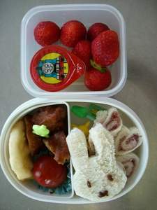 今日はひこうき弁当あれひこうきなのに目がある・・・・なんかおかしな事になったけどまっいっか。なんかお弁当箱に詰めにくくて、今日はばあちゃんと試行錯誤してこうなりました。 ひこうきの下にもジャムパン、たまごパンが入っています。そしてクリームコロッケ、トマト、アスパラ、いちごです。今日は幼稚園のクラスで初めての茶話会があって参加してきましたその間チビちゃんはおばあちゃんに見ていてもらいましたお天気が良かったのでお外でたくさん遊んでもらった様でした。おばあちゃんはホントにずっと遊んでくれるので大好きなんです。いつもおばあちゃんに助けてもらっています 茶話会の後初めてのランチを楽しませてもらって帰ってきました。お兄ちゃんは幼稚園で初めて運動会の練習があり、かけっこをしたようで「走る練習したー、でも遅かったよ。」あらら・・「かけっこ何番になりたーい?」と聞くと「5番!」だってー欲が無いのか、1番の良さを理解してないのか・・・運動会本番は果たして何位になるのか今から楽しみです。他の競技?もどんなことをやるのかすっごく楽しみです。そして助けに来てくれていたおばあちゃんがで帰っていきました。駅まで送りに行きましたがチビチャンはおばあちゃんが帰ってしまうと知ると怒って「ばあちゃん、いや」とそっぽむいたりして・・・そんな風に怒れるなんて、ここ何日かの成長っぷりに変に感心したりしました。明日の幼稚園は月に一度の「おむすびの日」です。この日はみんなから集めたお米を幼稚園で炊いてくれて何人かのママがお手伝いに行きママ達がおにぎりを作ってみんなで食べる日だそうです。他にはお味噌汁も出るそうです。なので明日はお弁当はお休みです。あさってのお弁当何にしようかな?